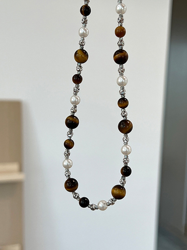 Men’s Tiger Eye Stone Irregular Silver Bead Necklace