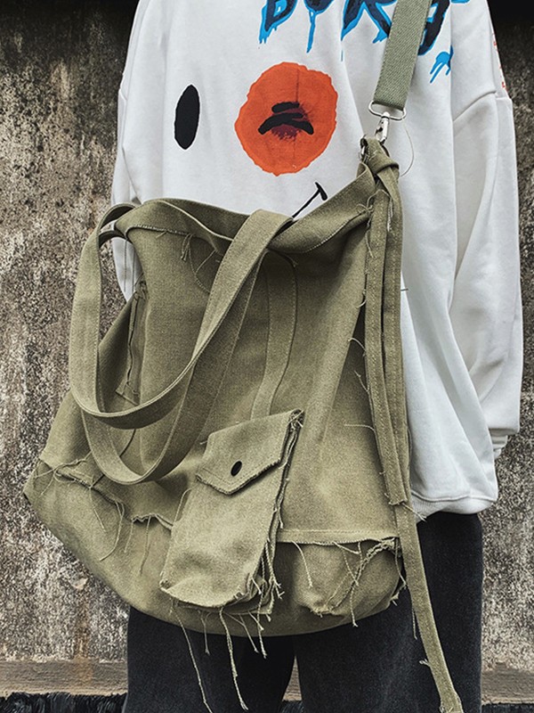 Vintage Distressed Raw Flap Zip Up Detail Shoulder Bag