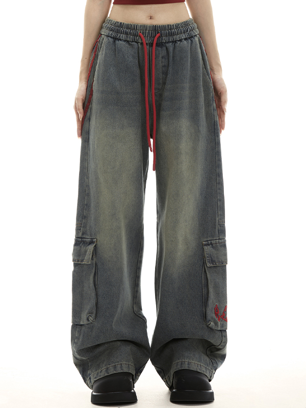 Men’s Vintage Top-stitching Drawstring Loose Jeans