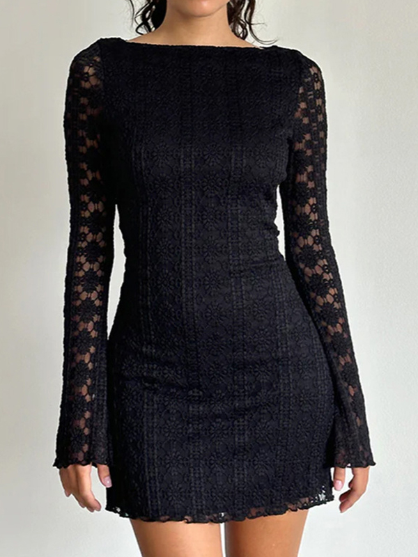 Solid Cutout Backless Shirred Trumpet Sleeve Mini Dress