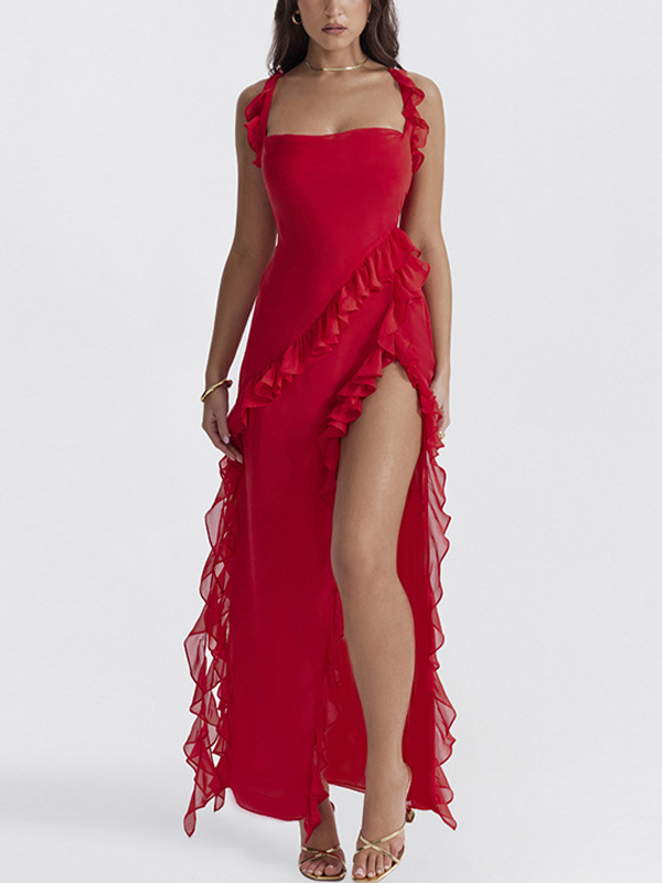 Solid Sleeveless Ruffled Hem Ruched Midi Dress