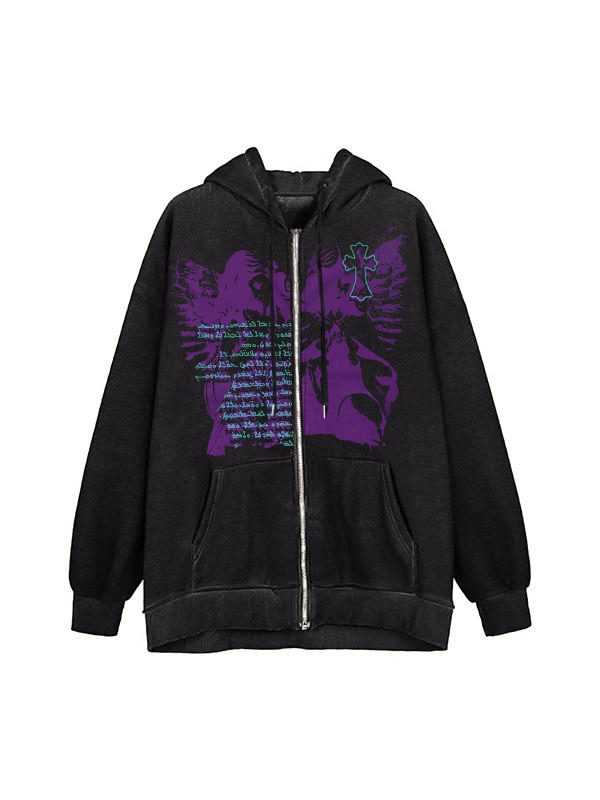 Vintage Cross Graphic Print Zip Up Oversized Hoodie