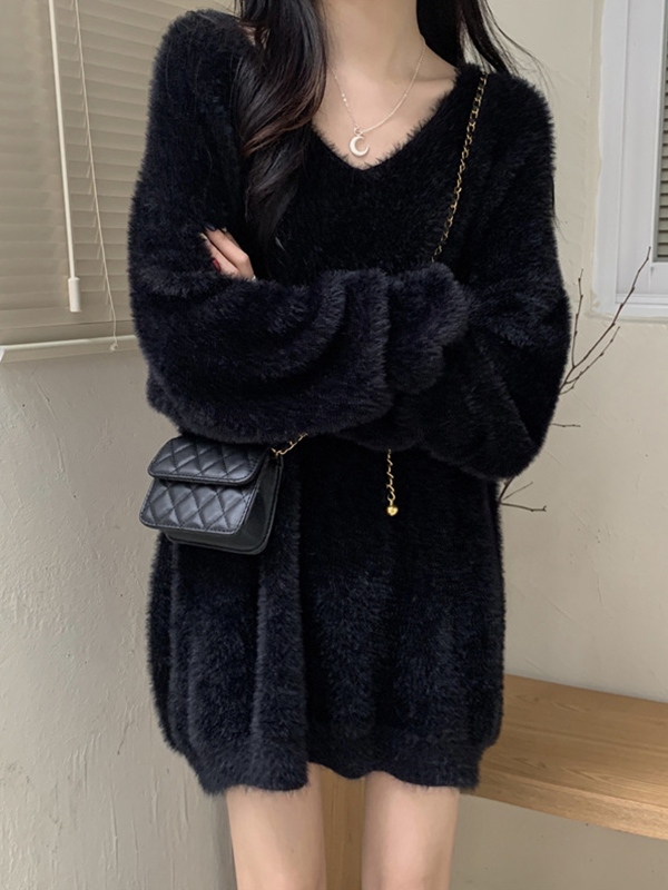 Solid V Neck Fuzzy Loose Sweater