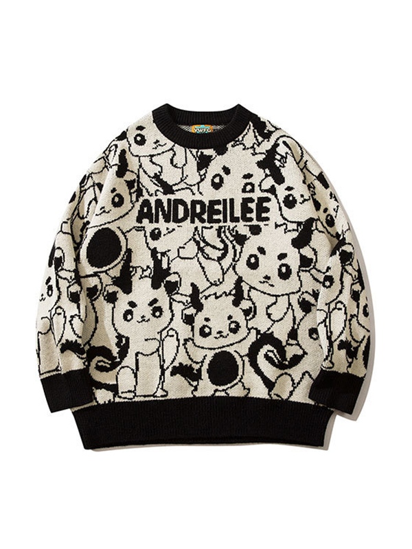 All Over Cartoon Jacquard Crew Neck Knit Sweater