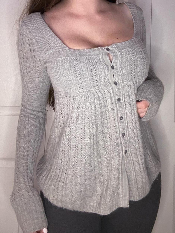 Solid Color Square Neck Bow Slim Long Sleeves Knits