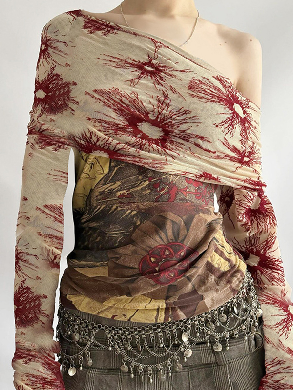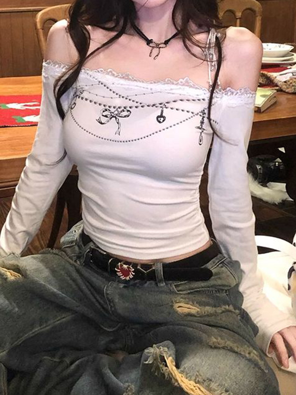 One Shoulder Lace Print Long Sleeve Tee