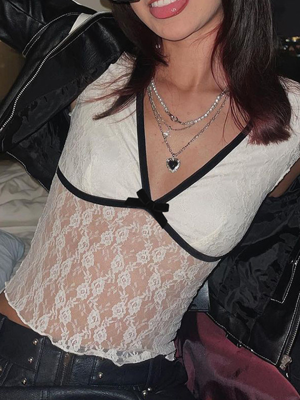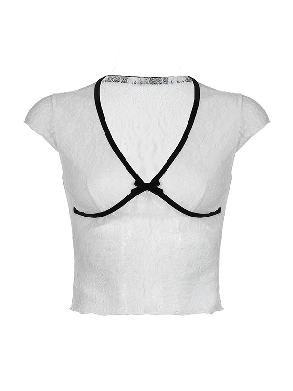 Lace Bow Splice V Neck Short Sleeve Tee