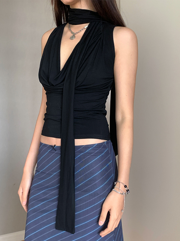 V Neck Ribbon Halter Neck Tank Top